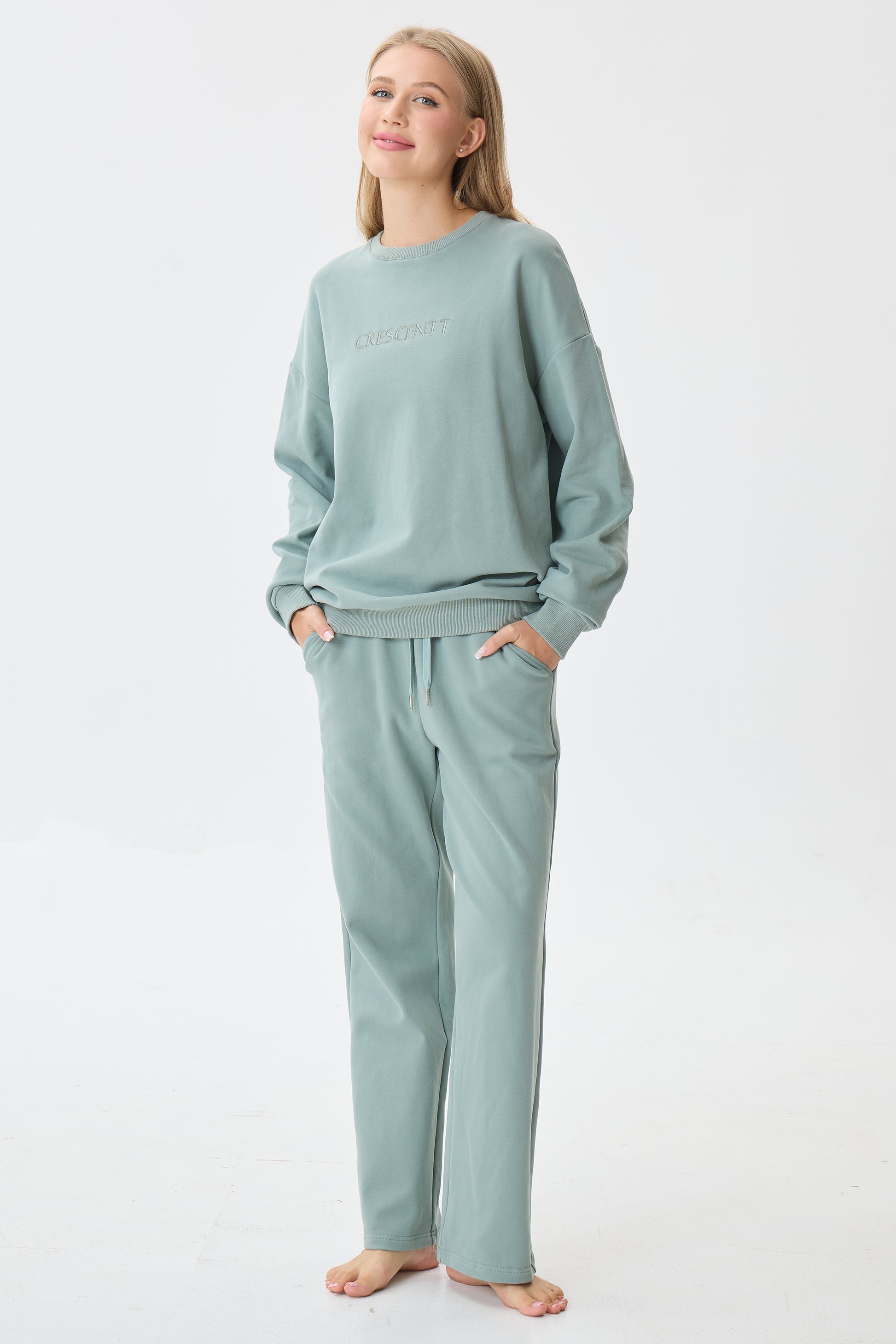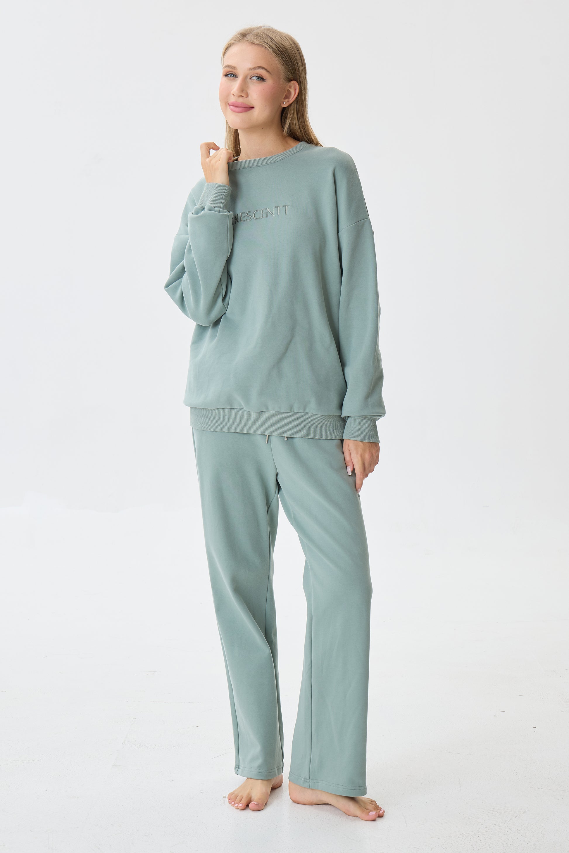 - Cozy crewneck pullover + full-length pants