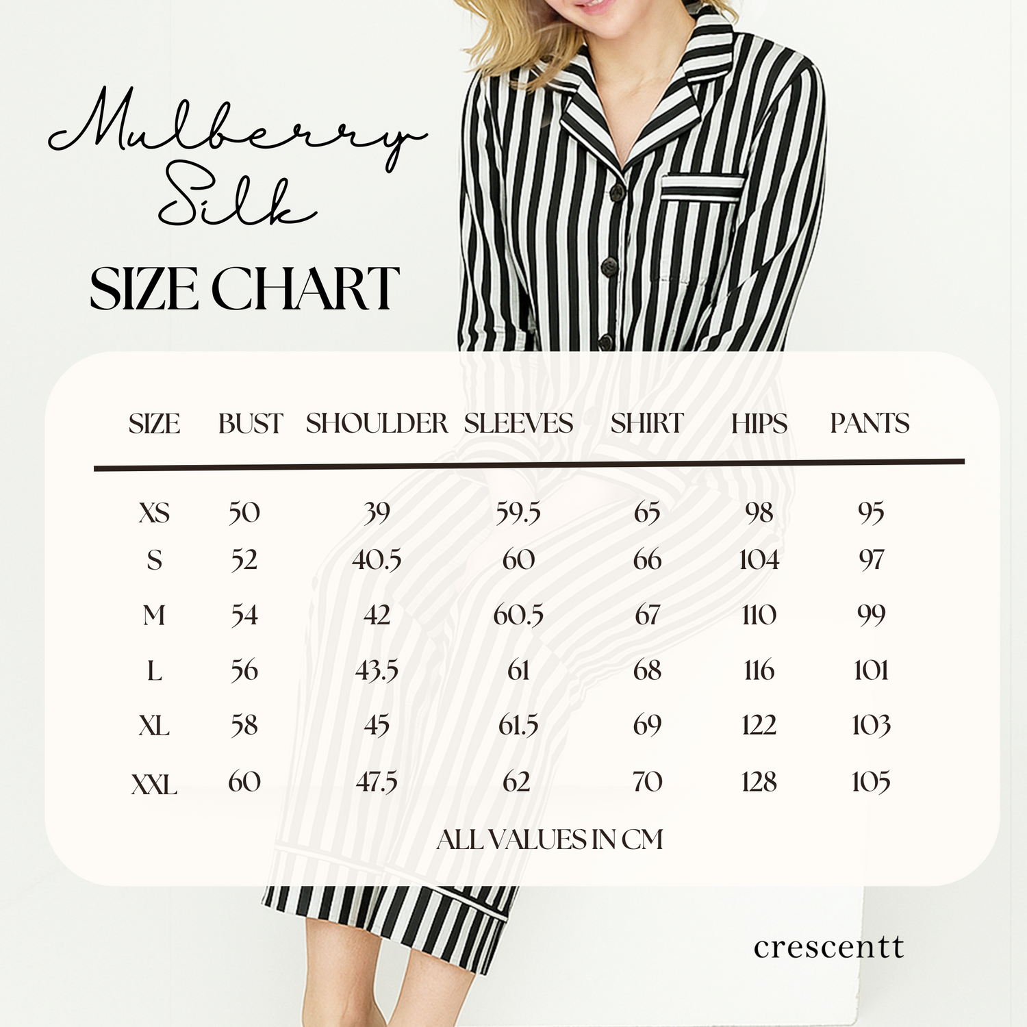Our Mulberry Silk 6A Pajama Sets are designed with a loose, relaxed fit for maximum comfort. Size down for a tighter fit.